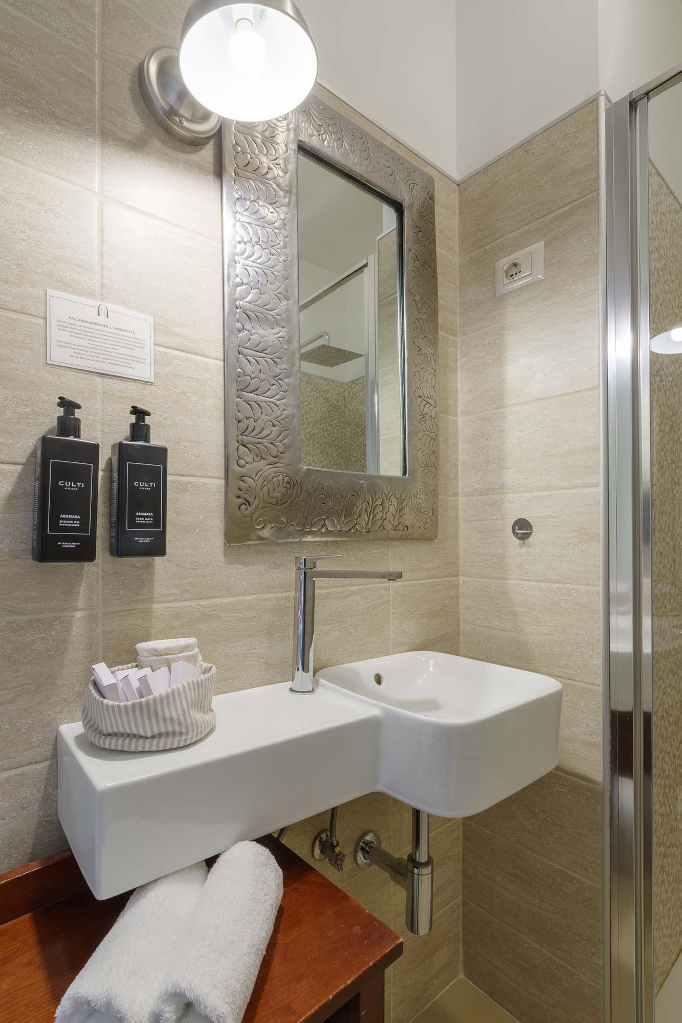 Una camera con due ambienti, uno adibito camera matrimoniale e l’altro dove trova posto una comodissimo chaise longue. Un’ampia terrazza, un bagno ed una enorme doccia con getti idromassaggio e cromoterapia completano la dotazione di questa camera che è al secondo piano dell’hotel.